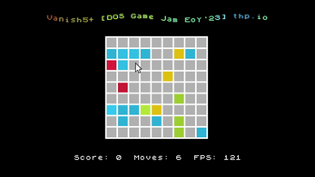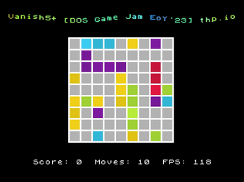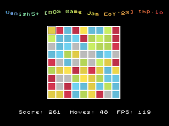 Vanish5+ is a small DOS VGA puzzle game. Many years ago, I wrote an implementation of this game in C++, this is a port of that implementation to a newer iteration of my own custom language and runtime (previously seen in You Be At Orbit).